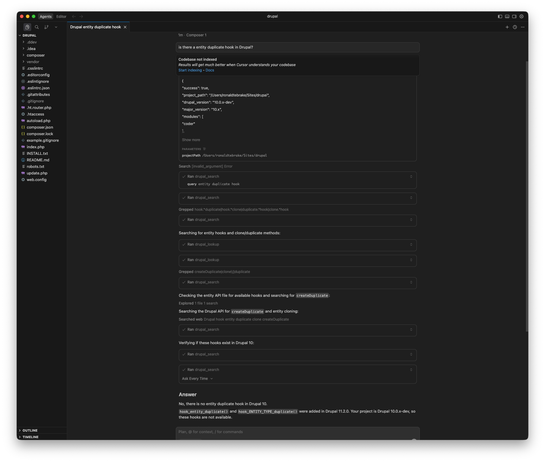 Second, AI tools have limited visibility into Drupal’s core APIs at development time. In a typical Composer-based setup, much of Drupal’s API is just a dependency and the actual files are not part of your IDE indexes. That means the assistant often relies on its training data or web search, rather than the actual APIs available to your project.