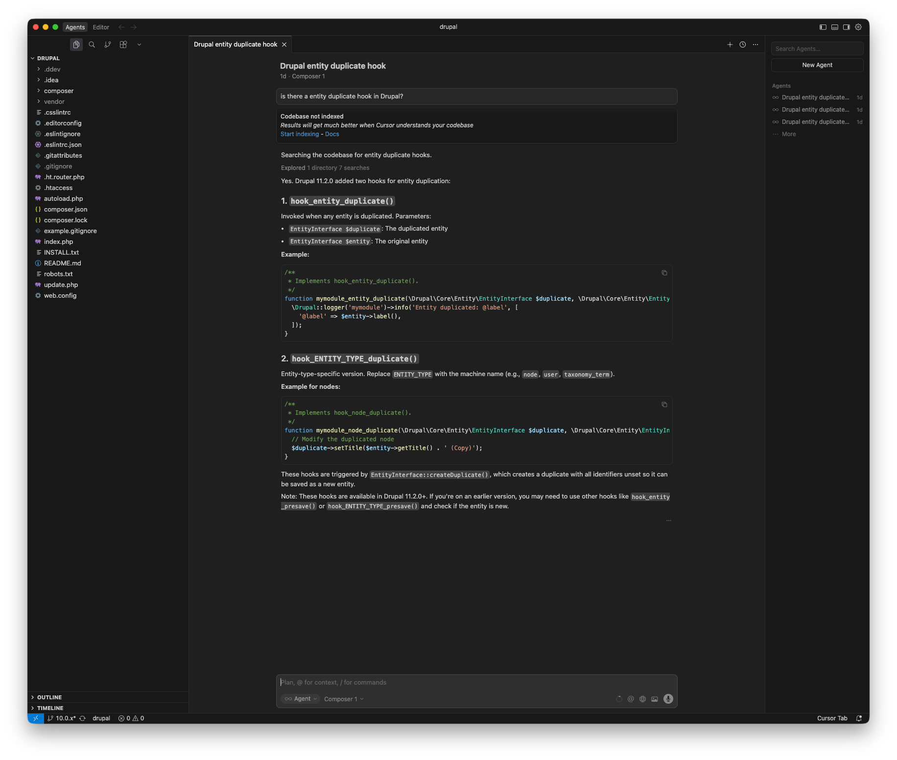 In Drupal 11.2.x New hook_entity_duplicate() and hook_ENTITY_TYPE_duplicate() hooks were introduced. When asking an AI assistant about entity duplication behavior, the correct answer depends entirely on whether those hooks exist in the current Drupal version.