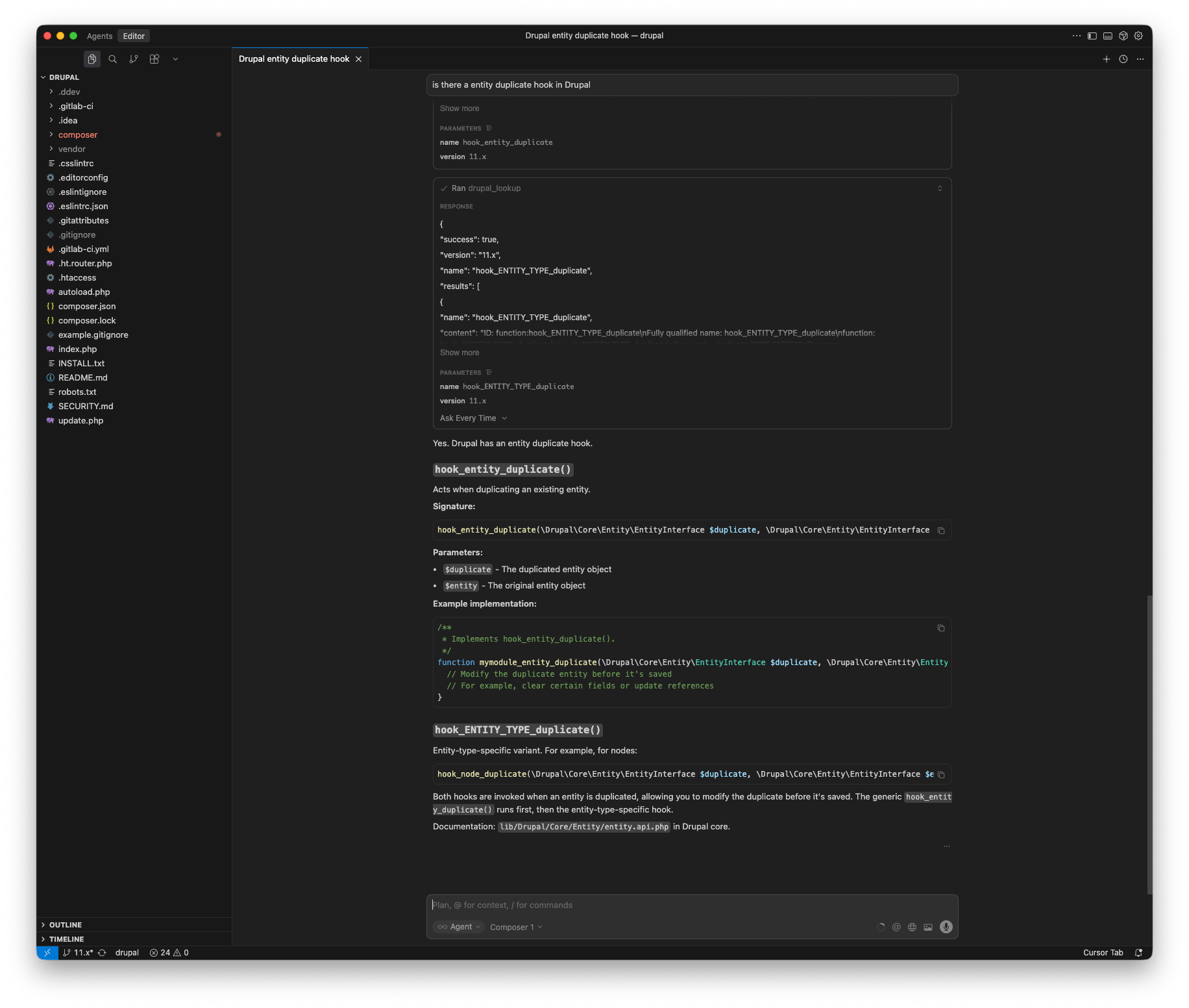 In a Drupal 11 environment, the same question now produces a different, version-appropriate answer. The AI correctly references the newly introduced hooks, because MCP exposes the relevant documentation for Drupal 11.2.x.